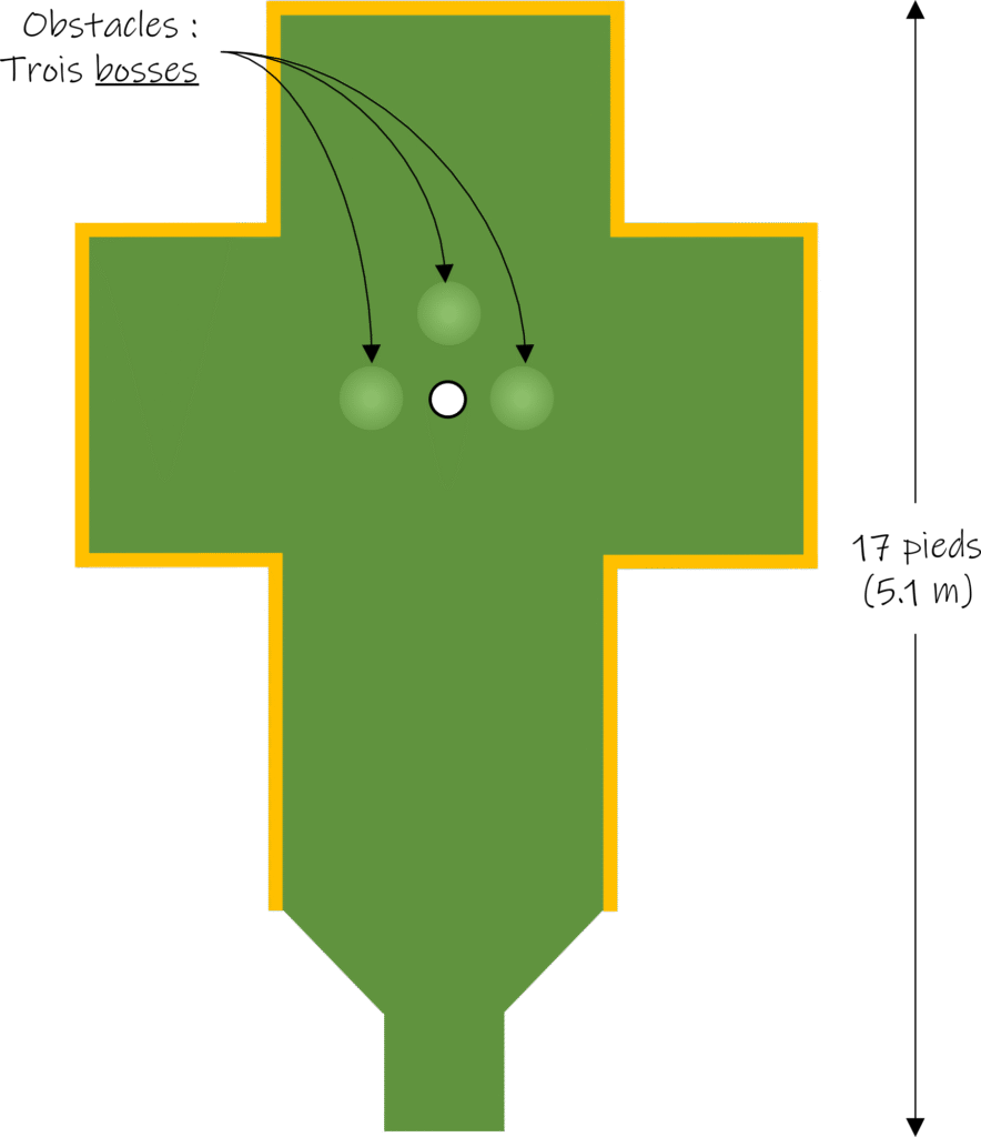 Armé de son putter Zebra, il s’installe sur le tee de départ. Il détermine rapidement que sa balle doit passer entre les quilles 2 et 5, puis emprunter la bosse de droite de la portion arrière du jeu. Le coup est très difficile – voilà le moment d’utiliser sa technique d’apnée qui lui a si bien servi à RDS.